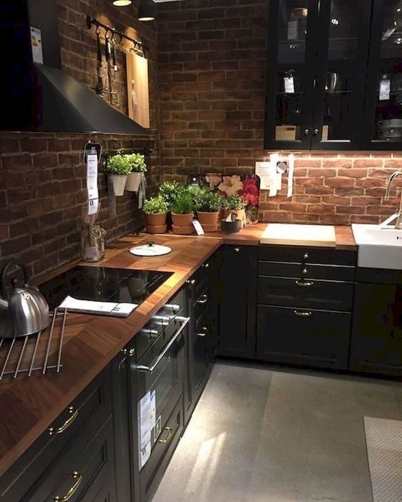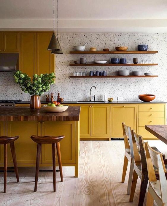 Cassez la couleur de vos meubles clairs en peignant une face de votre cuisine avec une teinte foncée tout en incorporant des étagères en bois sur votre mur pour un effet épuré et structuré.