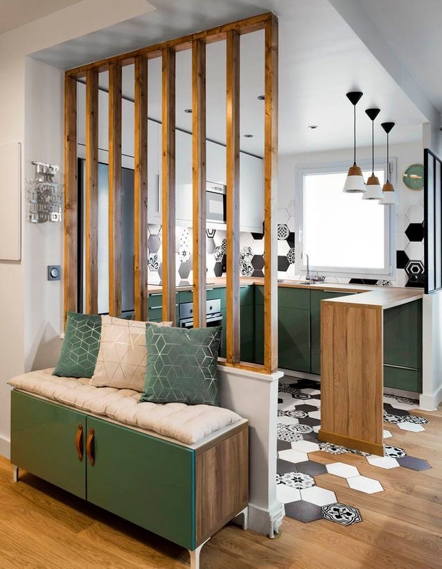 Séparez-la avec un claustra, jouez avec les matières (parement pierres, papier peint imitation briques, béton ciré, pose de parquet...) démarquez-la avec une peinture sombre au plafond.